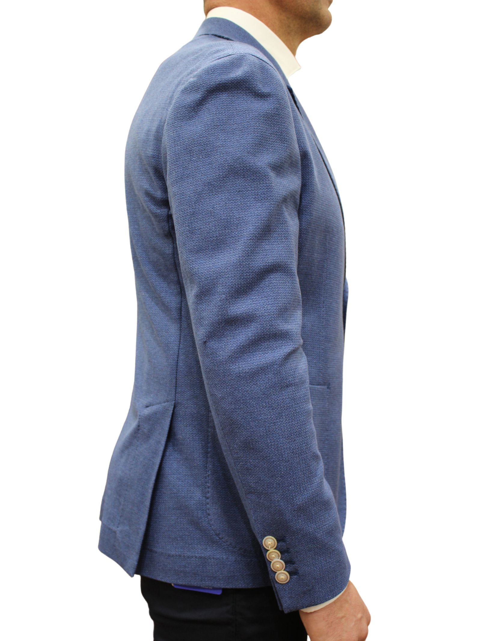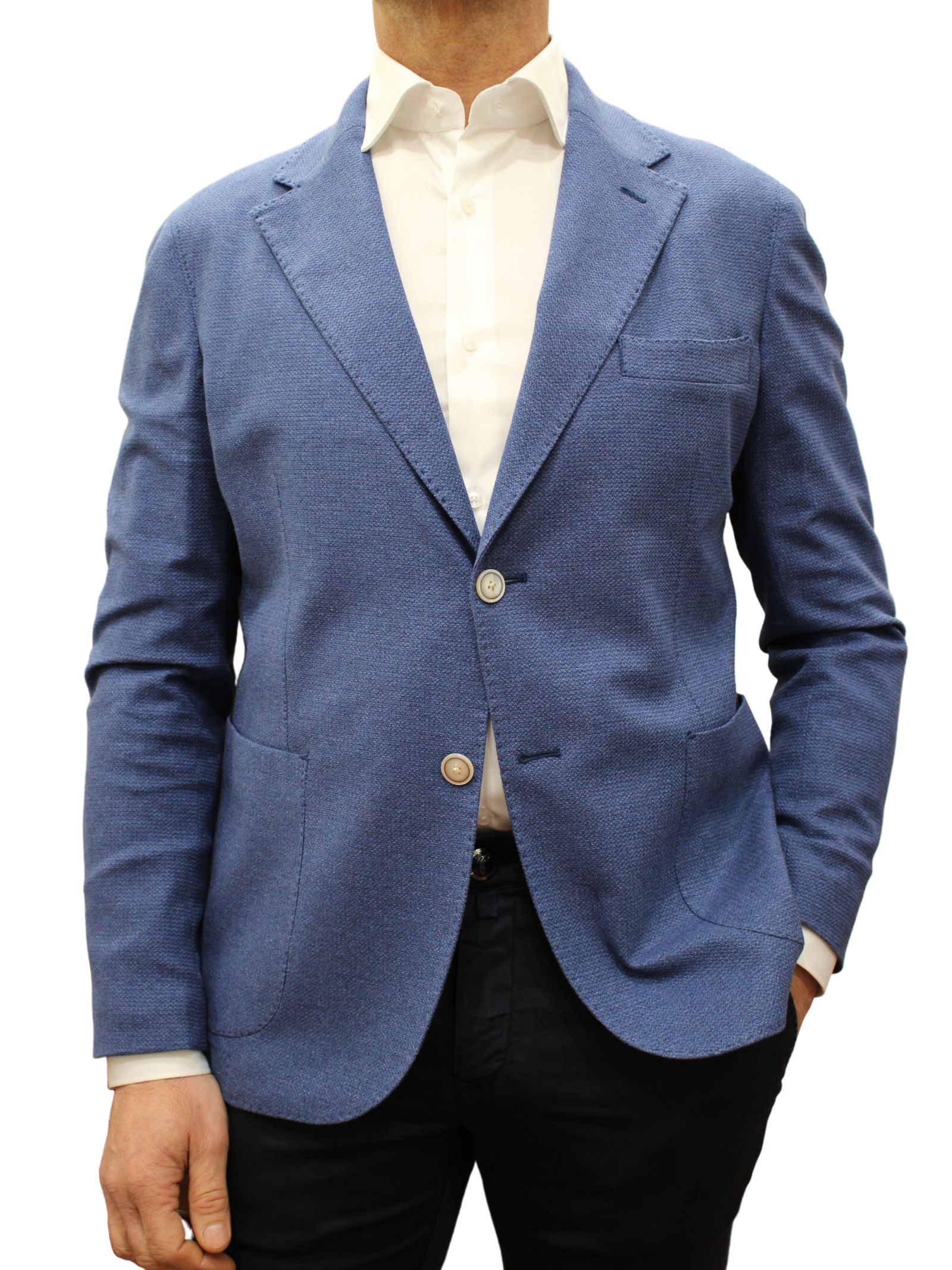 Due bottoni tasche a toppa e spacchetti laterali.