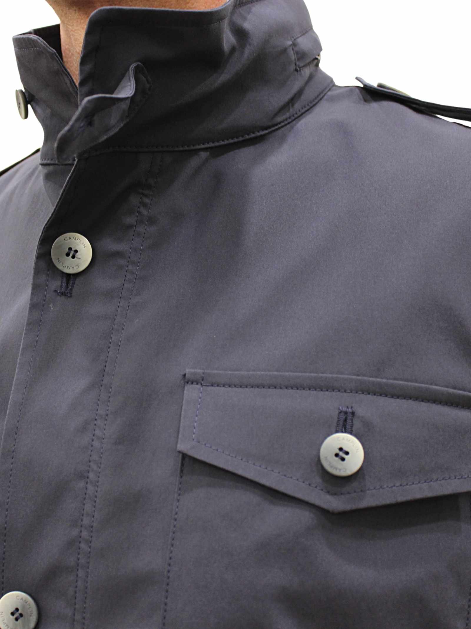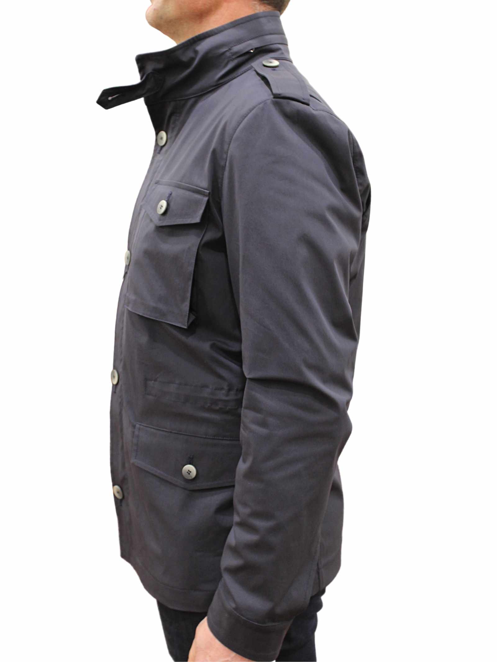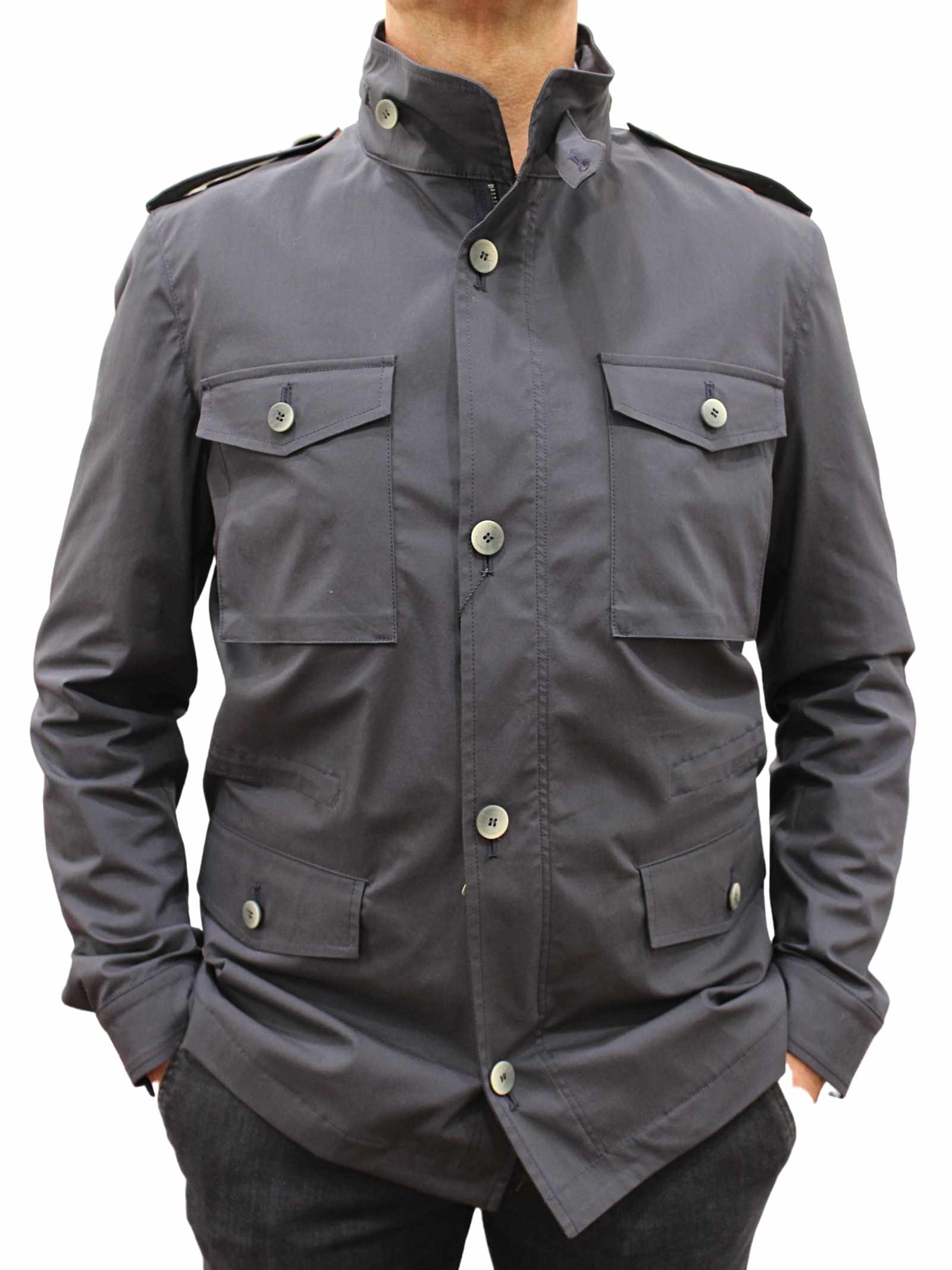 Giaccone uomo modello sahariana, cotone blu. Tasche con bottone. Chiusura con zip e bottoni.