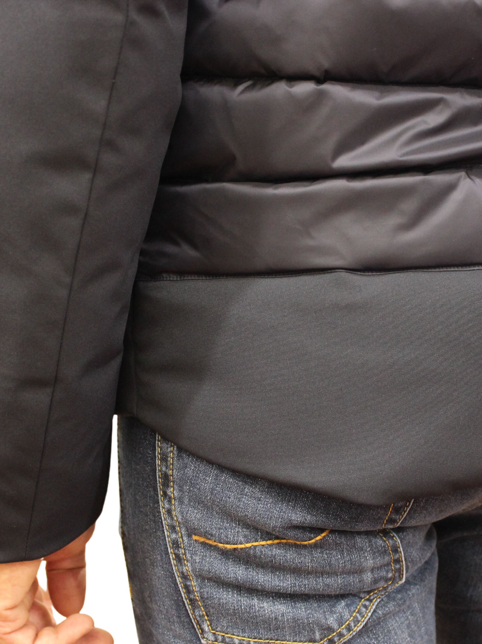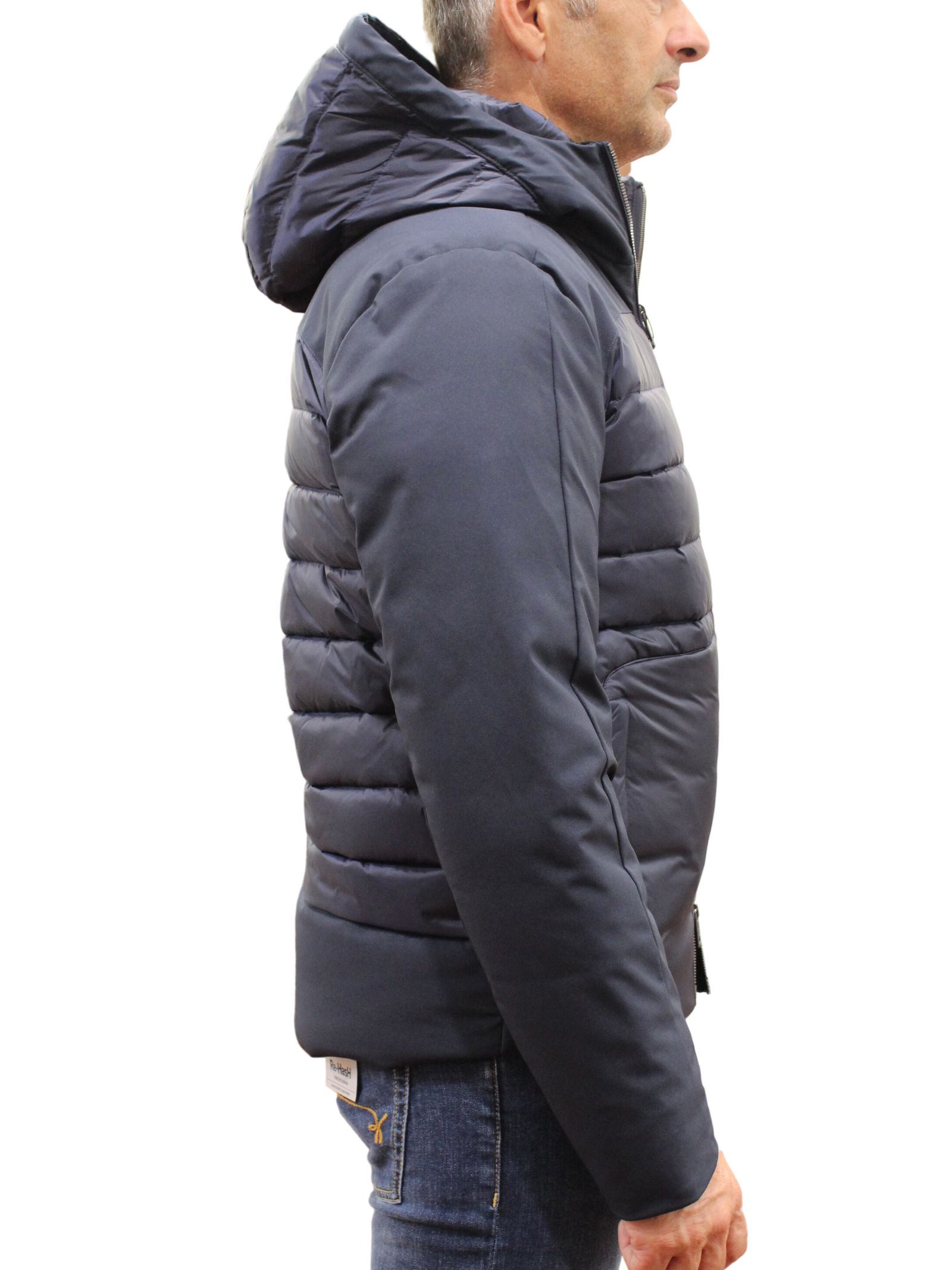 Piumino uomo dalla raffinata trapuntatura orizzontale. Tessuto tecnico sulle maniche e sul fondo. Imbottitura in piuma naturale per il massimo calore.