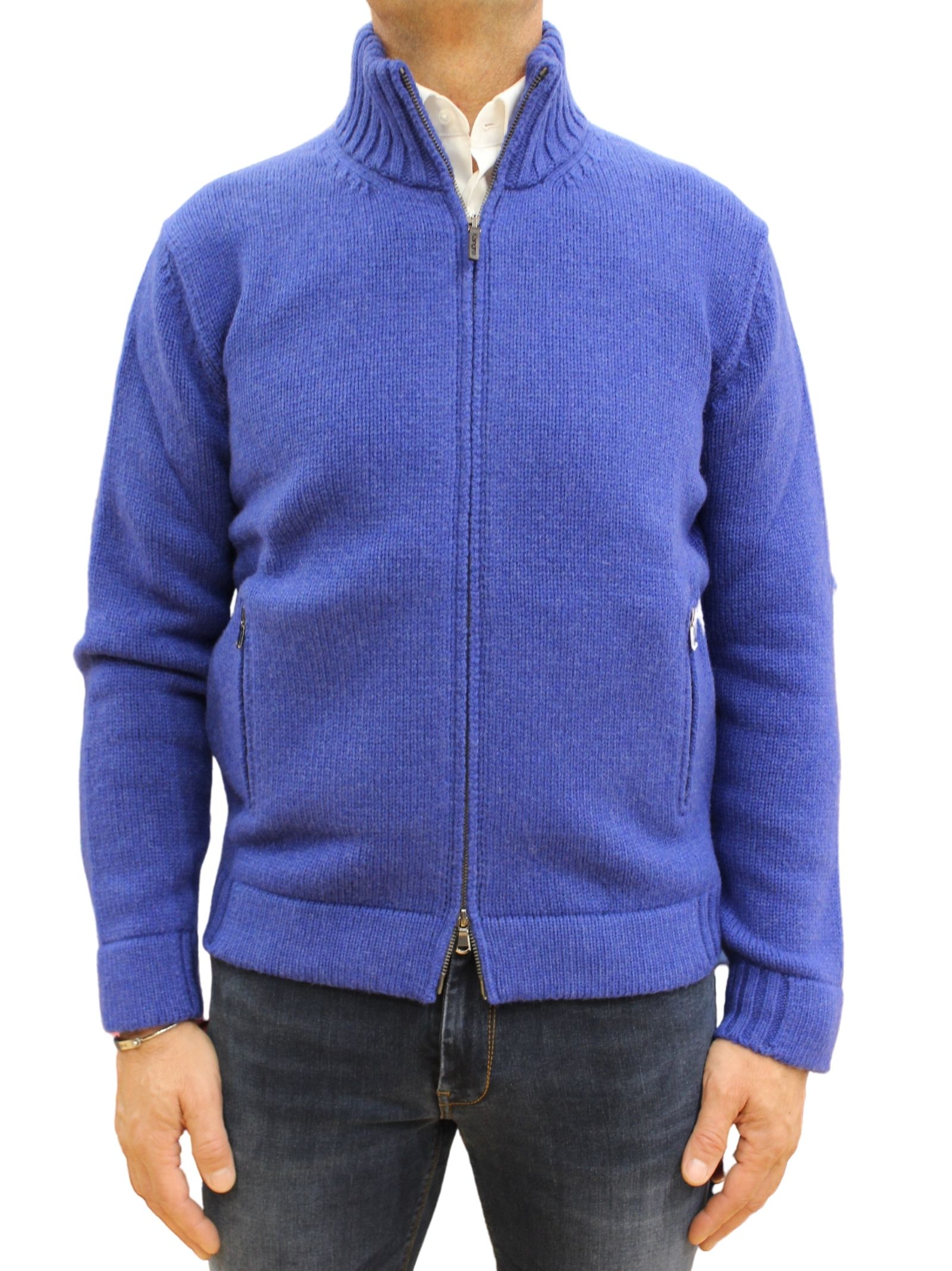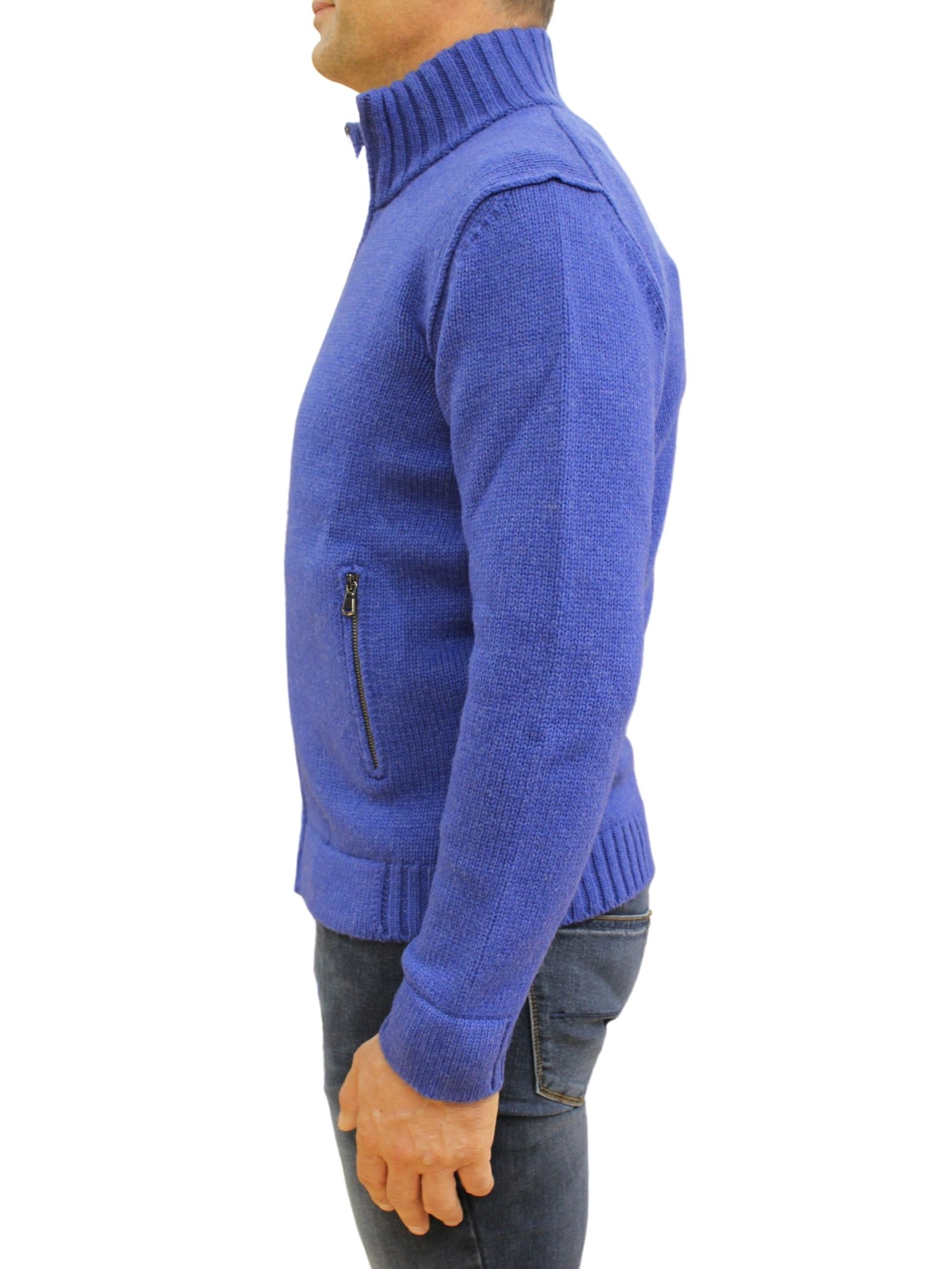 Cardigan uomo, lana merinos. Chiusra zip e tasche laterali.