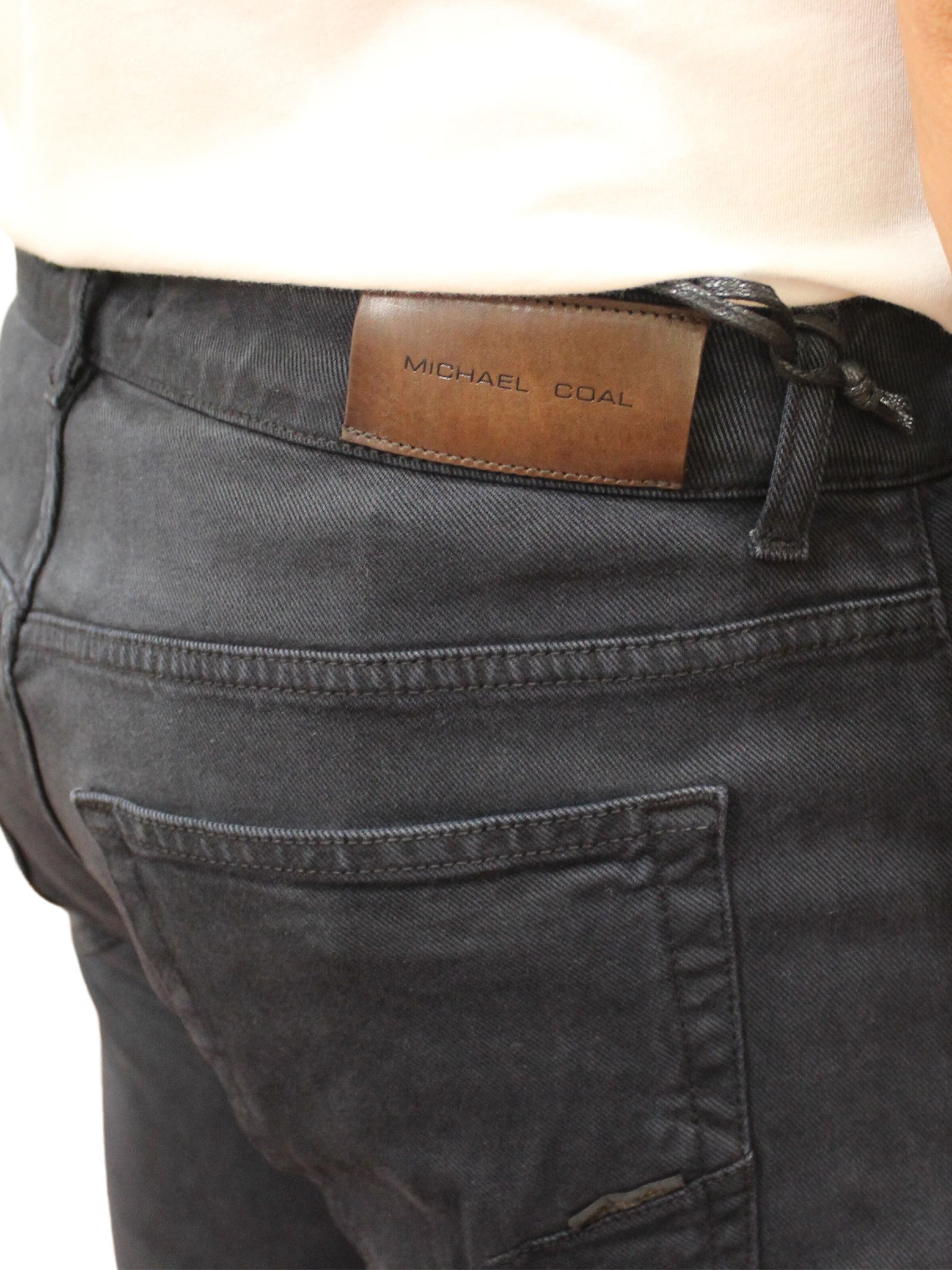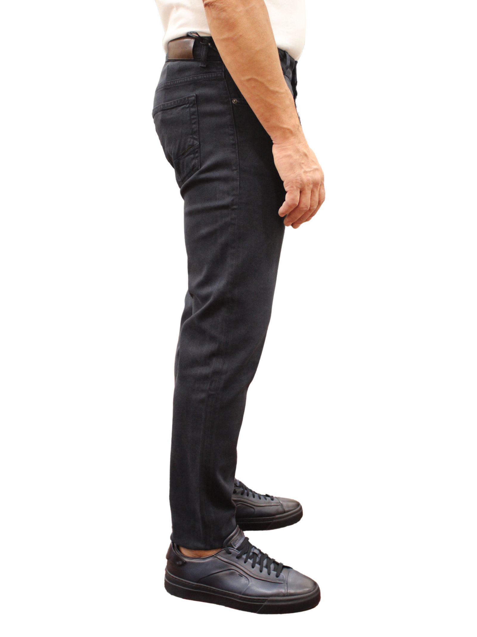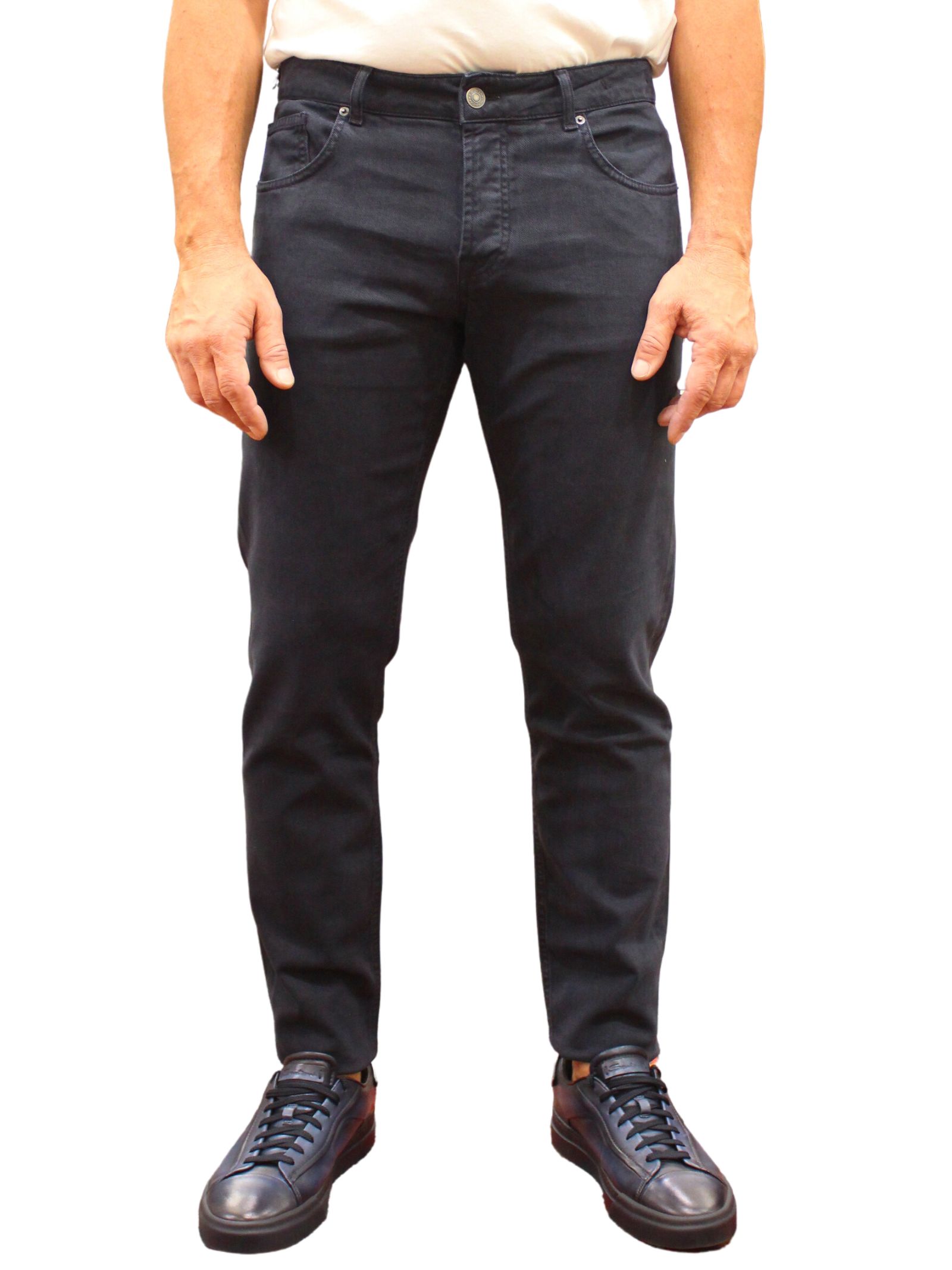 Jeans uomo 5 tasche in denim blu. Realizzato in Italia, chiusura a 4 bottoni, salpa in cuoio e impunture tono su tono.