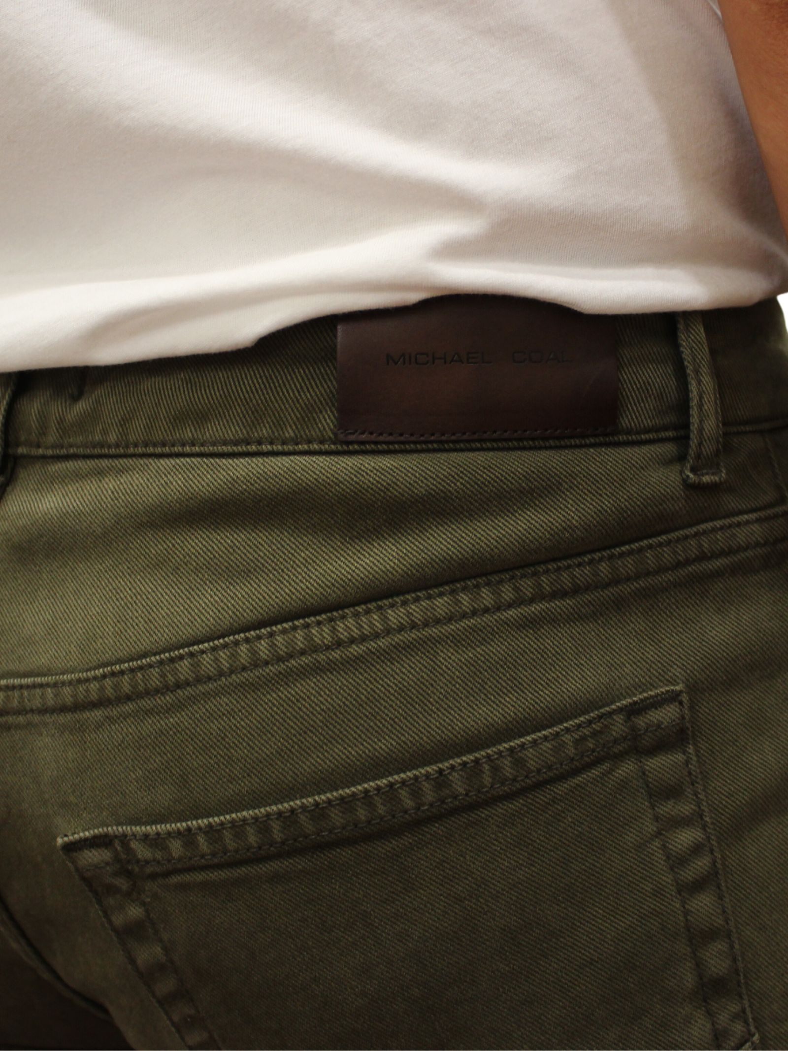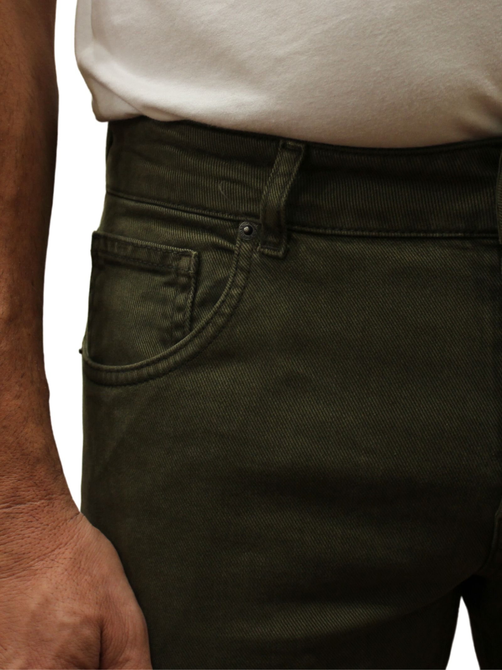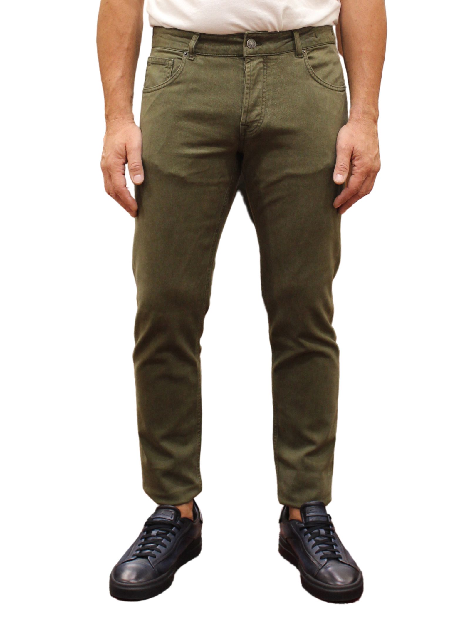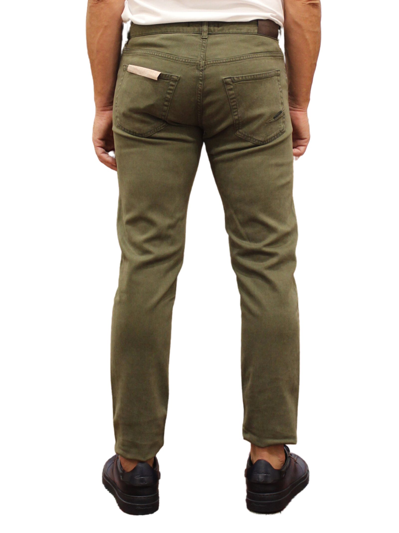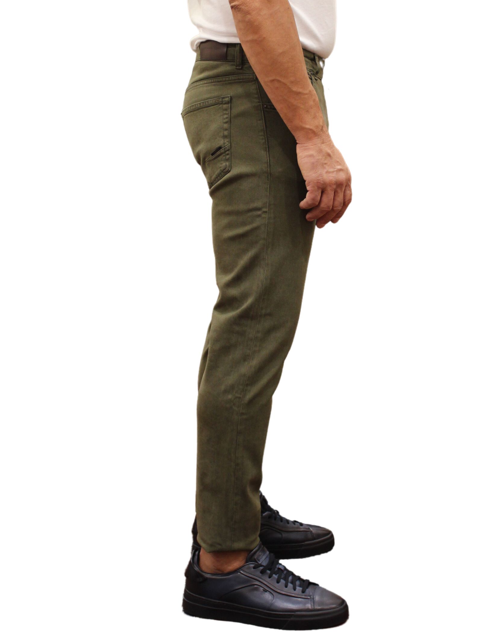 Jeans uomo 5 tasche in denim verde. Realizzato in Italia, chiusura a 4 bottoni, salpa in cuoio e impunture tono su tono.