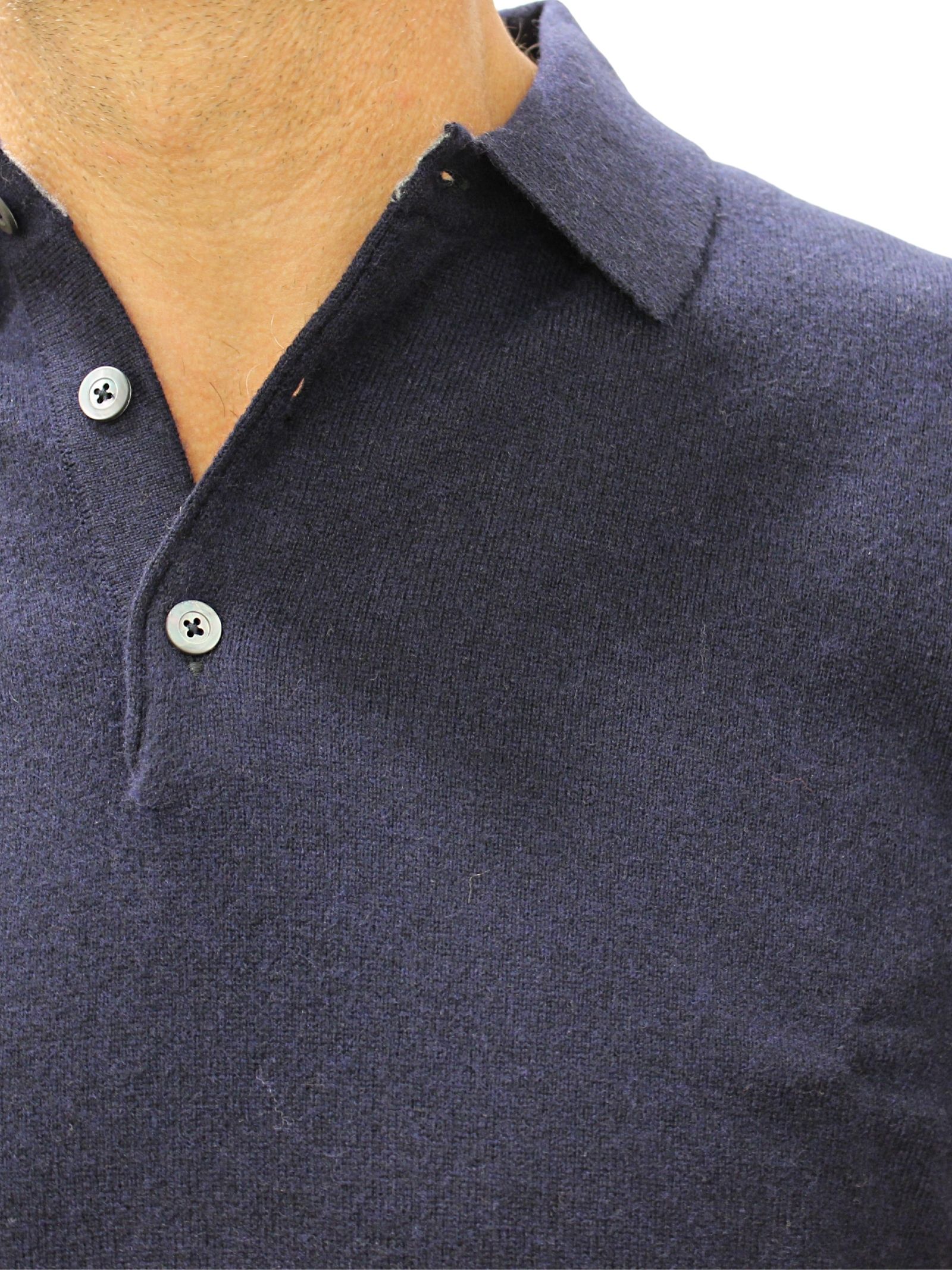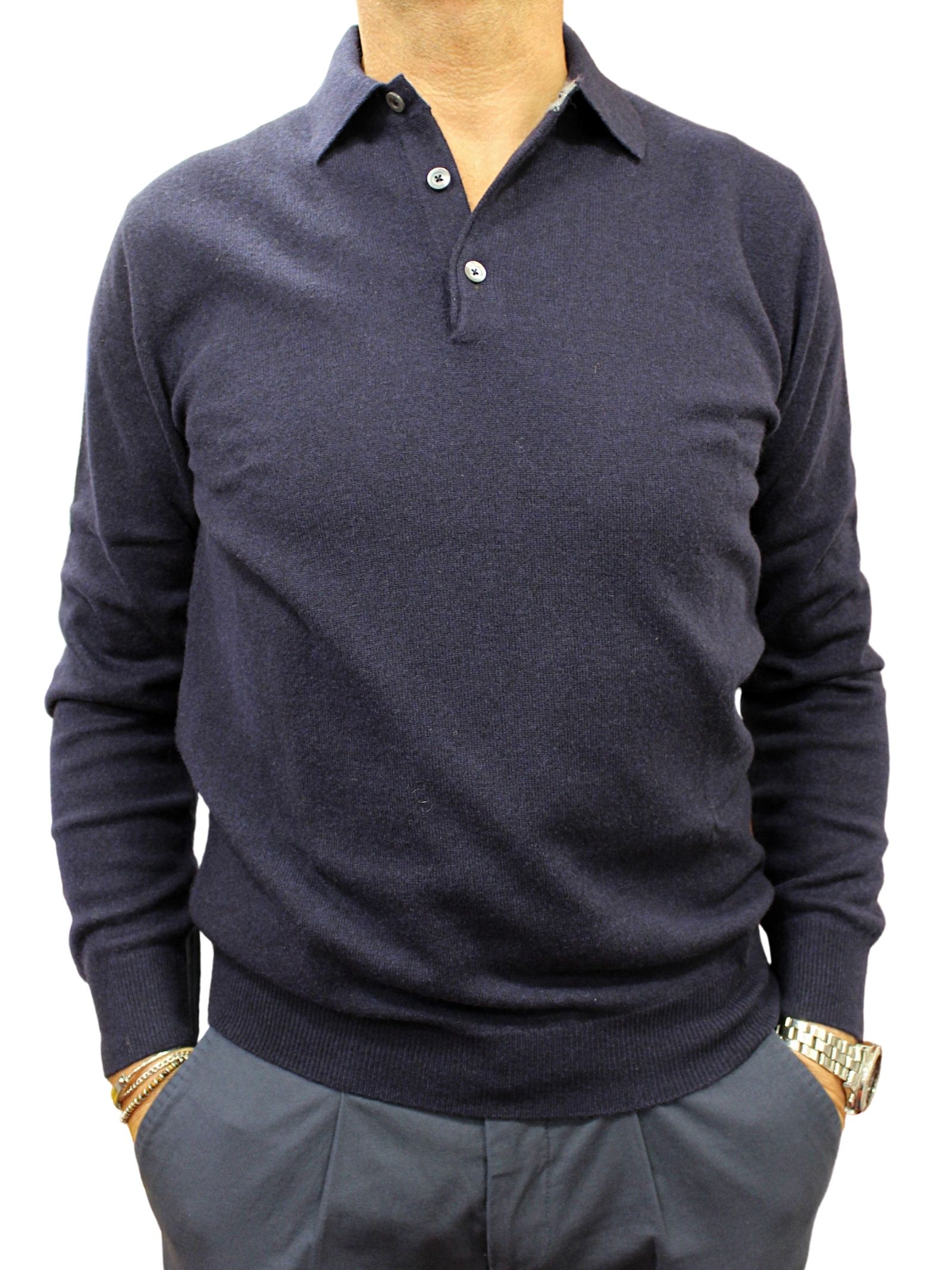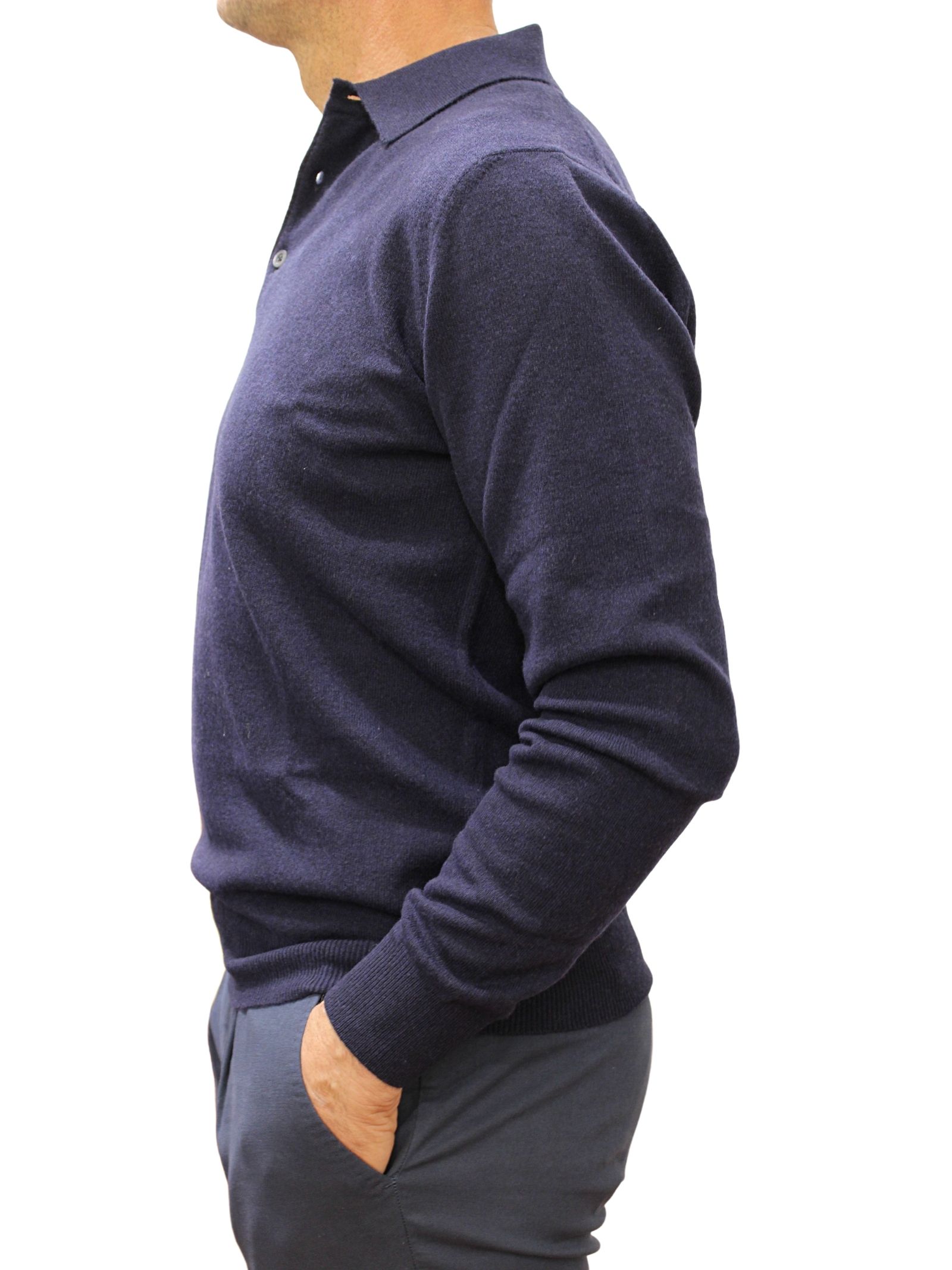 Polo uomo, manica lunga. Lana, seta, cashmere, colore blu.