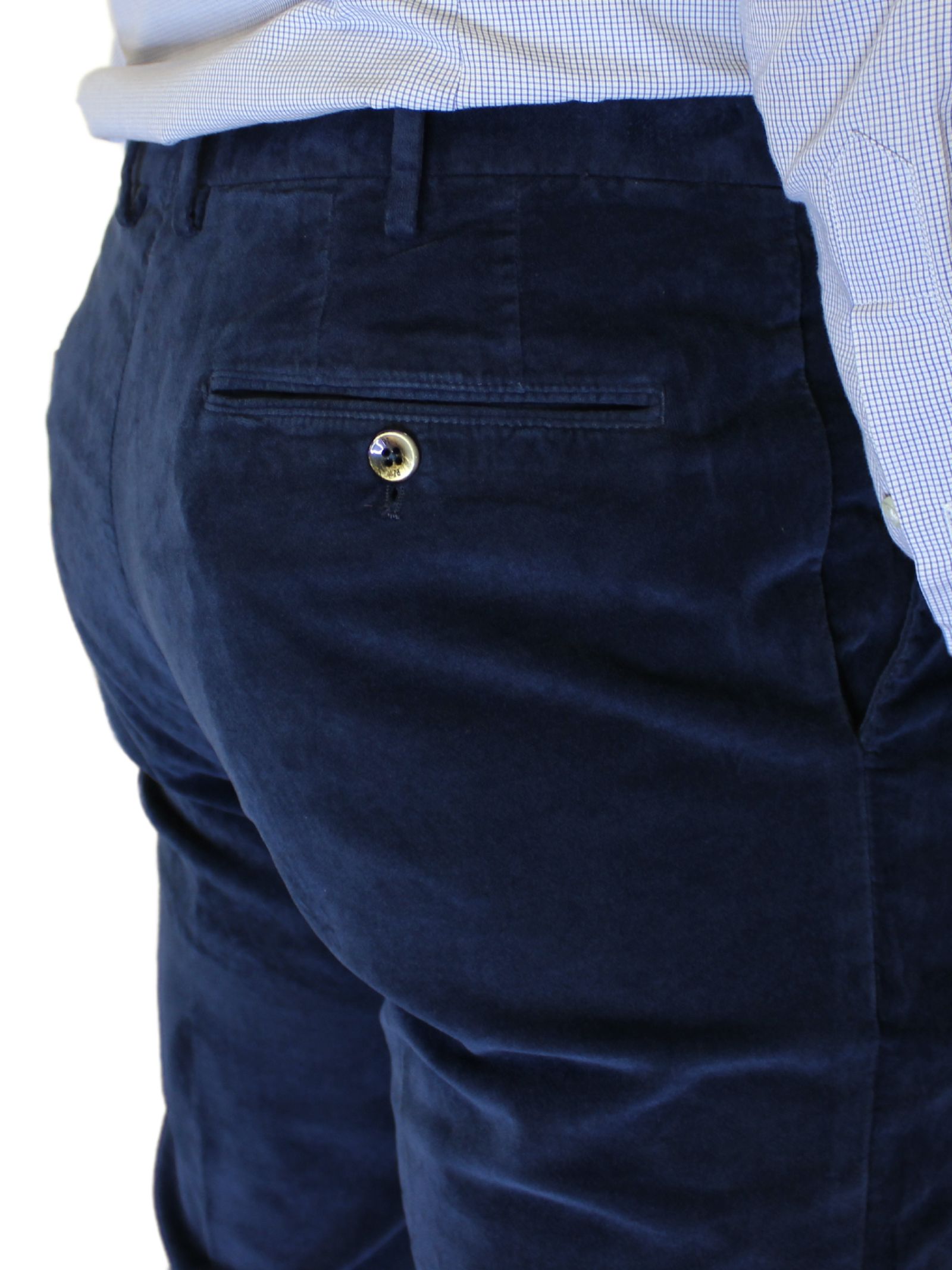 Pantaloni uomo tasca America in velluto liscio. Il modello stretch, realizzato con il 97% di cotone e il 3% di elastam, offre una vestibilità slim fit per un look moderno e confortevole.