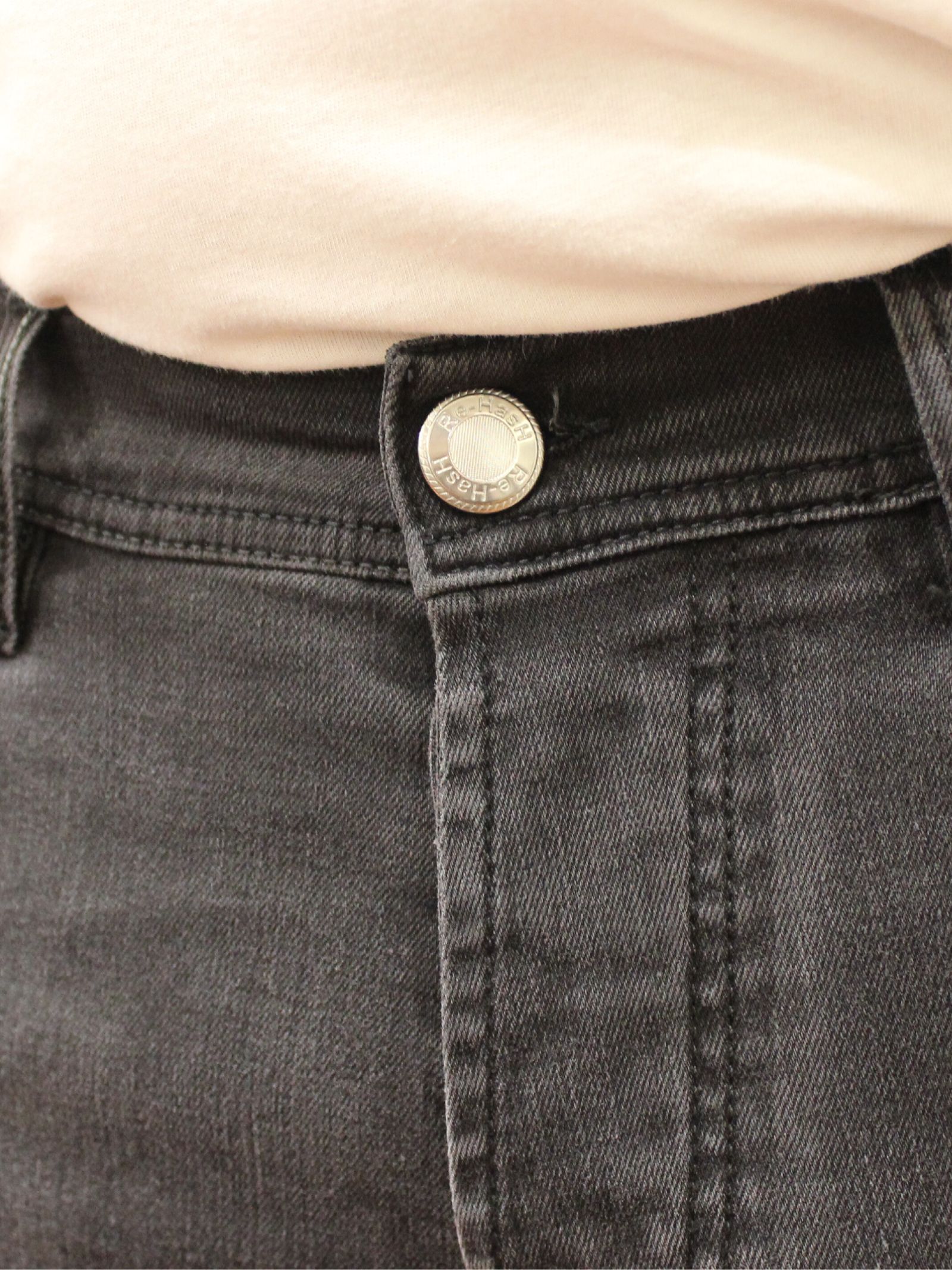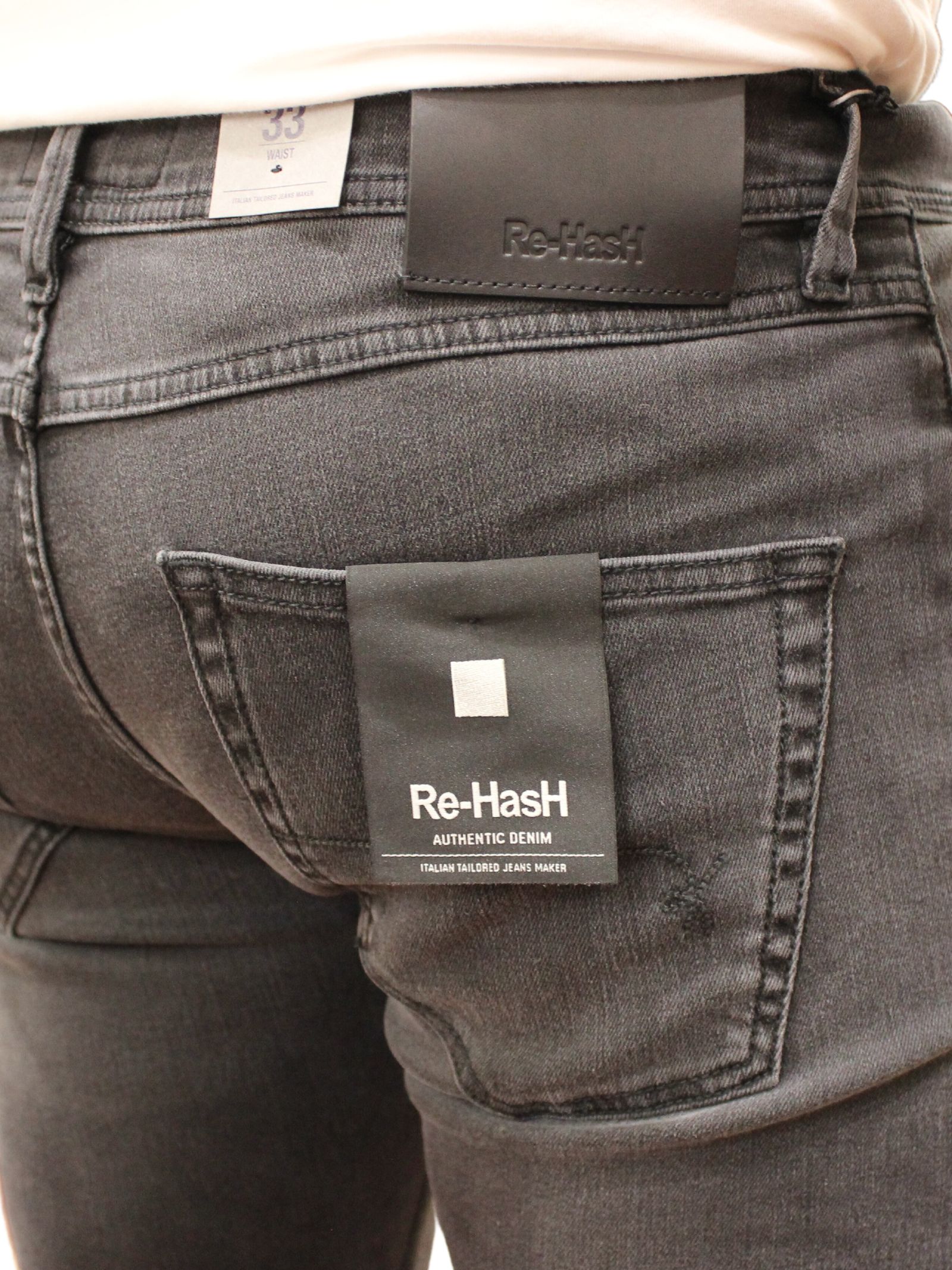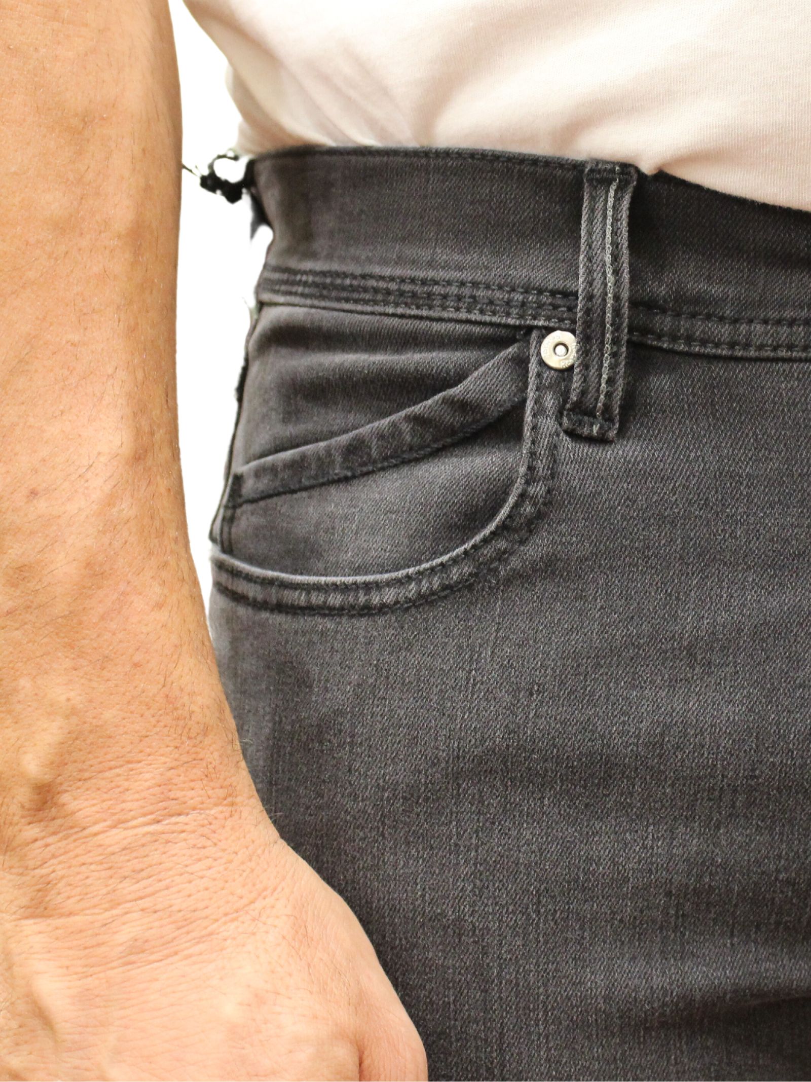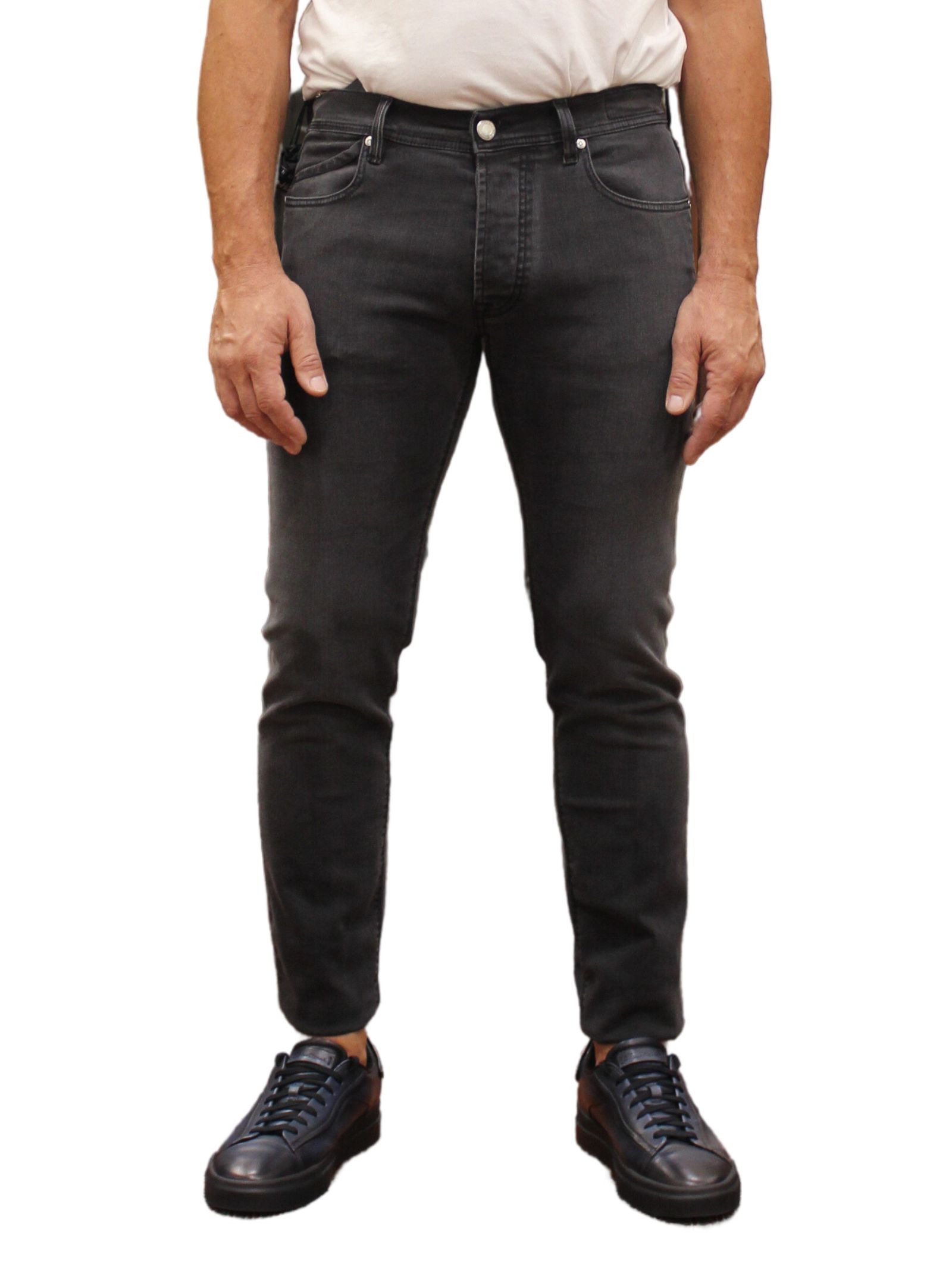 Jeans uomo modello Rupert in denim nero. Con chiusura a 4 bottoni in salpa cuoio nero e impunture tono su tono.